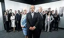 ![]() Promo group shot of Alan Sugar, Nick Hewer, and Margaret Mountford standing before the candidates for series 1 | |