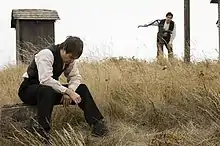 Nick Cave had a minor part in the latter part of the film.[21] He played a strolling balladeer in a crowded bar, where, unrecognized by the other patrons, Bob Ford had to listen to the lyrics of "The Ballad of Jesse James" as performed by Cave.[22] This folk song referred to Ford as a coward.