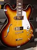 The Beatles' main instruments were Epiphone Casino guitars for John Lennon and George Harrison, McCartney's Höfner "violin" bass, and Starr's Ludwig drum kit.[36] After adopting the Epiphone as his stage guitar for 1966, beginning with the NME Poll-Winners Concert,[37] Lennon continued to use it throughout the Beatles' career.[38][39][nb 1] The band used new 100-watt Vox amplifiers throughout the tour.[36] Harrison played his Rickenbacker 360/12 guitar on "If I Needed Someone",[41] while a photo taken by Whitaker shows that Harrison's Gibson SG and McCartney's Rickenbacker 4001 were also among the guitars they took to Japan.[42]