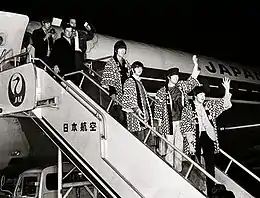 The four band members descended from the aircraft dressed in happi coats bearing the JAL logo. Their attire was a publicity coup for the airline,[84] who, recognising the value of being associated with the Beatles' financial success, had instructed one of its First Class flight attendants to ensure that the band emerged wearing these traditional Japanese coats.[85] Faced with a wall of glaring lights, the four musicians believed they were waving to a throng of fans, as was usual when they arrived in a new country.[75] In fact, they were surrounded by security personnel, and only twenty members of the public were present to witness their arrival.[34] Supervised by a large police presence, the band's fans were instead organised in groups along the road into the city.[75] In a 2016 feature article on the Beatles' Tokyo concerts, The Japan Times said that the photograph of the group dressed in JAL happi coats and descending from the plane had become "an iconic image of the Beatles' visit".[74]