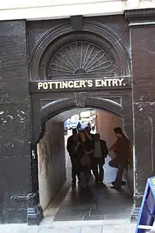 Pottinger's Entry (/ˈpɒtɪndʒərz/ POT-in-jərz) connects Ann Street with High Street in almost a straight line. The principal attraction is a Victorian pub, The Morning Star. The arched entrance from Ann Street is also Victorian and was retained when the original building was demolished in the 1990s. This entrance is a popular spot for buskers. This is undoubtedly the most obvious of the Entries, featuring large wrought-iron signs above each entrance archway.