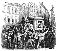 Renzo arrives in famine-stricken Milan and goes to the monastery, but the friar he is seeking is absent and so he wanders further into the city. A bakery in the Corsia de' Servi, El prestin di scansc ("Bakery of the Crutches"), is destroyed by a mob, who then go to the house of the Commissioner of Supply in order to lynch him. He is saved in the nick of time by Ferrer, the Grand Chancellor, who arrives in a coach and announces he is taking the Commissioner to prison. Renzo becomes prominent as he helps Ferrer make his way through the crowd.