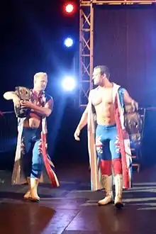 On 30 December 2010, edition of Impact! Magnus and the now–face Williams teamed together for the first time in ten months, when they wrestled their former stable mate and now–heel Rob Terry and A.J. Styles in a losing effort.[32] On 31 March 2011, edition of Impact!, Williams and Magnus officially reformed the British Invasion by attacking the team of Eric Young and Orlando Jordan, thus once again establishing themselves as a heel group.[33] In their first match back together, Williams and Magnus were defeated by Ink Inc. (Jesse Neal and Shannon Moore) on 12 April edition of Xplosion.[34] On 17 April at Lockdown, Williams and Magnus were defeated again by Ink Inc. in a four tag team number one contenders' steel cage match.[35] Despite not having won a single match since their reformation, it was announced on 2 June edition of Impact Wrestling that the British Invasion would receive a shot at the TNA World Tag Team Championship at Slammiversary IX.[36] At the pay-per-view, Williams and Magnus were unsuccessful in their challenge for the title, losing to the team of James Storm and Alex Shelley, who filled in for Robert Roode, who was sidelined with a storyline injury.[37] On 30 June edition of Impact Wrestling, Williams and Magnus turned face by responding to Mexican America's bad remarks by praising the United States. They were then attacked until Rob Terry, who had been recently exiled from Immortal, returned to save them, effectively adding him back to the group.[38] On 14 July edition of Impact Wrestling, Mexican America's Anarquia and Hernandez defeated Williams and Magnus in a TNA World Tag Team Championship number one contender's match, following outside interference from their stablemate Rosita.[39] After the grudge match, Terry's reunion with Magnus and Williams was abruptly forgotten as he no longer accompanied them to matches and eventually formed a new alliance with Robbie E.[40] In December, Magnus went on to form a new tag team with Samoa Joe to rival tag team champions Crimson and Matt Morgan. On 2 February 2012, edition of Xplosion, it was announced that due to Magnus' alliance with Joe, the British Invasion had disbanded. On 18 March 2013, The British Invasion reunited to take part in the World Cup of Wrestling. Magnus and Williams also reunited on 2 February 2014 for the Joker's Wild II pay-per-view.[41]