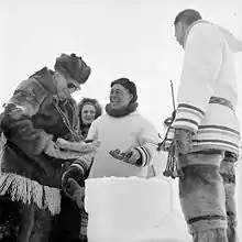 Federal and provincial viceroys also met with First Nations leaders for more ceremonial occasions, such as when in 1867 Canada's first governor general, the Viscount Monck, received a native chief, in full feathers, among some of the first guests at Rideau Hall.[90] The Marquess of Lansdowne smoked a calumet with Aboriginal people in the Prairies,[91] the Marquess of Lorne was there named Great Brother-in-Law,[92] and the Lord Tweedsmuir was honoured by the Kainai Nation through being made a chief of the Blood Indians and met with Grey Owl in Saskatchewan.[93] The Earl Alexander of Tunis was presented with a totem pole by Kwakiutl carver Mungo Martin, which Alexander erected on the grounds of Rideau Hall, where it stands today with the inukshuk by artist Kananginak Pootoogook that was commissioned in 1997 by Governor General Roméo LeBlanc to commemorate the second National Aboriginal Day.[94] Governor General the Viscount Byng of Vimy undertook a far-reaching tour of the north in 1925, during which he met with First Nations and heard their grievances at Fort Providence and Fort Simpson.[95] Later, Governor General Edward Schreyer was in 1984 made an honorary member of the Kainai Chieftainship, as was one of his viceregal successors, Adrienne Clarkson, who was made such on 23 July 2005, along with being adopted into the Blood Tribe with the name Grandmother of Many Nations.[96] Clarkson was an avid supporter of Canada's north and Inuit culture, employing students from Nunavut Arctic College to assist in designing the Clarkson Cup and creating the Governor General's Northern Medal.[96]