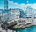 In 1892 The Drawbridge was replaced by the elegant stone St Augustine's Bridge; at the same time the docks to the north were infilled. The new area, which was called Magpie Park, was enclosed by Colston Avenue.[5] It was named after the newspaper The Bristol Magpie, whose offices were located on the western side of Colston Avenue.[16] The Bristol Industrial and Fine Arts Exhibition was held here in 1893; this popular attraction saw 500,000 attendees and raised £2200 for charity.[17]