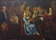 The painting depicts a small crowded room hosting a concert involving either a fortepiano or harpsichord, cello, and flute.[1] The central figure, the bonneted young women dressed in an elegant blue and yellow gown and playing the piano, gazes toward the spectator. To her right and surrounding the piano are fashionably dressed older men. Two hold canes, and two hold private conversations. Two fixate, perhaps leer, at the young woman. One gentleman holds perhaps a small wind instrument in his hand. Near the woman's right foot, is a cat, facing away from us. The scene, somewhat unsettling, appears to convey some cryptic allegory.