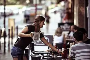While the university is in session, The Corner is especially active at lunchtime, when faculty, staff, and students adjourn there for the midday meal. Patrons of the Corner's sidewalk cafés can be found spending time over a good book or simply sipping coffee and people watching.[2] Of the 67 businesses in the district, all but sixteen are locally owned, though there has been an increase in chain stores recently.[1] The Corner is encompassed by a Charlottesville historic district, limiting redevelopment and demolition.[1]