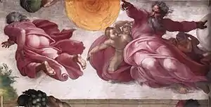 The Creation of the Sun, Moon and Plants (sometimes The Creation of the Sun, Moon and Vegetation or The Creation of the Sun and the Moon) is one of the frescoes from Michelangelo's nine Books of Genesis scenes on the Sistine Chapel ceiling. It is the second scene in the chronological sequence on the ceiling, depicting the third and fourth day of the Creation narrative together in on panel.[1][2]