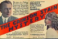 The Crimson Stain Mystery is a 1916 American horror film serial directed by T. Hayes Hunter.[1] The Crimson Stain Mystery was poorly received upon release.[2]
