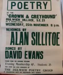 The Crown and Greyhound is particularly associated with the "Bards in the Boozer",[33] who met there monthly during the 1960s.[34] B. S. Johnson and Zulfikar Ghose, were invited by Howard Sergeant to organise some of the meetings, and celebrated writers and poets reading at the Crown and Greyhound during this period included Alan Sillitoe, Ted Hughes, Edwin Brock, and Jenny Joseph.[35] A photo exists of B. S. Johnson "looking bored senseless at a Dulwich Group poetry reading", upstairs at the Crown and Greyhound.[36] Zulfikar Ghose describes the Dulwich Poetry Group as, "not formed as such, but evolving into one", and states that the contemporary photos of a reading at the Crown and Greyhound, taken for the cultural magazine Scene were, "all posed". He also recounts that Harold Pinter and Theodore Roethke were both persuaded to give readings.[34]