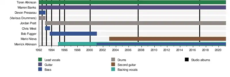 The original three members of the band, at the January 1992 formation, were Toren Atkinson, Warren Banks and Quentin Rogers. Quentin, though, never appeared on any of their releases, nor played at any of their public performances. The first bass player to appear with the band at a show was Devon Presseau.[43] The band has gone through several bassists and drummers since its inception. Thomas R. Falk has toured and played with the band as a second guitarist.