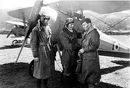The scene in which Scott takes off with Courtney clinging to the wing, switches to a shot of a Travel Air 4U Speedwing fitted with a round cowl over its Comet engine to resemble the Nieuports. Stunt pilots included Leo Nomis, Rupert Symes Macalister, Frank Tomick and Roy Wilson.[11] Several Thomas-Morse S-4 aircraft were used in the 1930 film. The S-4 was an American built fighter aircraft that did not see combat in World War I. Plentiful in 1930, the S-4s were becoming rare by the time the 1938 film was produced, hence the re-use of aircraft sequences from the original film. Some in-flight scenes with principal actors were staged with aircraft hoisted up by wires to a height of 25 feet. Stage hands then rocked the aircraft to simulate flight, but when one of the wires snapped, on screen, Barthelmess appeared startled, unaware that an accident had occurred, and simply thought the swaying aircraft was part of the scene.[12]