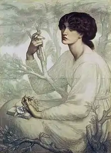 During 1878 Rossetti completed a chalk sketch of Morris,[1] his secret lover, whom he had met at the Theatre Royal, Drury Lane, in 1857.[2] She was the model for several of his well-known paintings, including Proserpine.[2] The drawing was displayed above the mantlepiece in Rossetti's studio.[3] Initially the painting was to be called Monna Primavera,[4] or Vanna Primavera,[5] possibly inspired by La Vita Nuova,[5] a narrative that captivated Rossetti[6] and was the basis for earlier of his works of art.[7] Rossetti was also a poet and penned sonnets to accompany several of his paintings;[8] the last composition in his series entitled Sonnets for Pictures is associated with this painting.[9] The sonnet reads:[10]