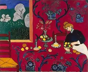 The Dessert: Harmony in Red is a painting by French artist Henri Matisse, from 1908. It is considered by some critics to be Matisse's masterpiece.[1] This Fauvist painting follows the example set by Impressionism with the overall lack of a central focal point.[2]