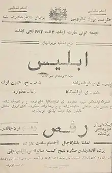 Iblis[1][2] (Azerbaijani: İblis / ابلیس) is a verse play (verse dram), tragedy in four acts of an Azerbaijani poet and playwright Huseyn Javid, written in 1918. Ideological credo of Javid is revealed in the play, a mystic flaw[3] is strongly expressed and the poet's thoughts about a problem of human's happiness followed by the imperialistic war are reflected in the poem.[4]