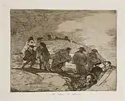 The group begins with Tristes presentimientos de lo que ha de acontecer (Gloomy presentiments of what must come to pass), in which a man kneels in the darkness with outstretched arms. The following plates describe combat with the French, who—according to art critic Vivien Raynor—are depicted "rather like Cossacks, bayoneting civilians", while Spanish civilians are shown "poleaxing the French."[1] Plates 31 to 39 focus on atrocities and were produced on the same batch of plates as the famine group.[25] Others are based on drawings Goya had completed in his Sketchbook-journal, in studies where he examined the theme of the grotesque body in relation to the iconography of the tortured or martyred one. In his India ink wash drawing We cannot look at this (1814–24), he examined the idea of a humiliated inverted body with pathos and tragedy, as he did to comical effect in The Straw Mannequin (1791–92).[26]