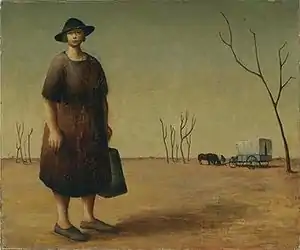 The Drover's Wife is a 1945 painting by Australian artist Russell Drysdale. The painting depicts a flat, barren landscape with a woman in a plain dress in the foreground. The drover with his horses and wagon are in the background.[1] The painting has been described as "an allegory of the white Australian people's relationship with this ancient land."[1] Henry Lawson's 1892 short story "The Drover's Wife" is widely seen as an inspiration for the painting, although Drysdale denies that.[2]