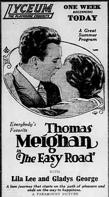 The Easy Road is a 1921 American silent drama film directed by Tom Forman and written by Beulah Marie Dix. The film is based upon a story by Blair Hall. The Easy Road stars Thomas Meighan, Gladys George, Grace Goodall, Arthur Edmund Carewe, Lila Lee, Laura Anson, and Viora Daniel. The film was released on February 13, 1921, by Paramount Pictures.[1][2]