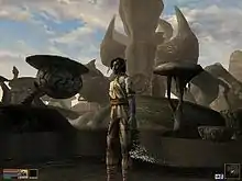 Morrowind takes place on Vvardenfell, an island in the Dunmer-dominated province of Morrowind, far from the typically European-inspired lands to the west and south depicted in Daggerfall and Arena. Along with graphical improvements, one of the most apparent differences between Morrowind and the earlier games in the series is that Morrowind takes place in a much smaller area than the previous games. While Arena featured the entirety of Tamriel as an explorable area, and Daggerfall featured sizeable portions of two provinces of Tamriel, Hammerfell, and High Rock, Morrowind includes only the "relatively small" island of Vvardenfell within the province of Morrowind.[15] The change was a result of a conscious choice on the part of the developers to feature more detail and variety in the game. Whereas Daggerfall and Arena's dungeons were randomly generated, each area in Morrowind was specifically detailed, and each item individually placed. As a result, reviewers were generally impressed with the game world's variety, as this maintained the perception of an "enormous" game-world.[15] The game area expands to the walled city of Mournhold on Morrowind's mainland in the Tribunal expansion, and the island of Solstheim to the northwest of Vvardenfell in the Bloodmoon expansion.