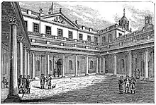Internally, however, it consisted of various spaces. On either side of the front entrance in Corn Street were a coffeehouse and tavern, each of four storeys. Above and below the main entrance were rooms designed as strongrooms. In the centre of the Exchange was an open court, surrounded by a colonnade.[3] At the back of the building was a two-storey range, consisting of an arcade on the ground floor and a long first-floor room. Facing All Saints Lane were two four-storey houses for business or trades persons, and on the frontage to Exchange Avenue were a further three houses. Below these various elements were cellars. Those below the five houses were each separate; the others were mostly interconnected.[2]
