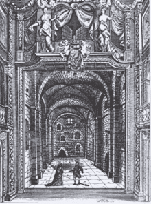 The Fairy-Queen was first performed on 2 May 1692 at the Queen's Theatre, Dorset Garden in London by the United Company. The author or at least co-author of the libretto was presumably Thomas Betterton, the manager of Dorset Garden Theatre, with whom Purcell worked regularly. This belief is based on an analysis of Betterton's stage directions.[3] A collaboration between several playwrights is also feasible.[4] Choreography for the various dances was provided by Josias Priest, who also worked on Dioclesian and King Arthur, and who was associated with Dido and Aeneas.