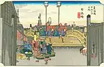 The Hōeidō edition is properly titled Tōkaidō Gojūsan-tsugi no uchi (東海道五十三次之内).[7] Besides the fifty-three stations themselves, the series includes one print for the departure, Nihonbashi (the bridge of Japan), and a final one, the 55th print, Keishi, Kyoto, the imperial capital.