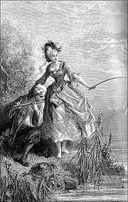 La Fontaine had made of the story an artificial pastoral in which Tircis tried to charm the fishes to the hook of the shepherdess Annette but did not succeed until he used a net to catch them. It ended with the cynical reflection that force accomplishes more than charm in the context of statecraft, which echoes the conclusion in Herodotus.[6] However, different morals were drawn by other writers. According to Babrius, only when one succeeds is it time to rejoice.[7] For William Caxton and Roger L'Estrange, the lesson to be learned is that there is a proper time and place for everything.[8]