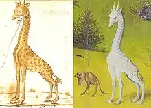 The surrounding landscape is populated by hut-shaped forms, some of which are made from stone, while others are at least partially organic. Behind Eve rabbits, symbolising fecundity, play in the grass, and a dragon tree opposite is thought to represent eternal life.[20] The background reveals several animals that would have been exotic to contemporaneous Europeans, including a giraffe, an elephant, and a lion that has killed and is about to devour his prey. In the foreground, from a large hole in the ground, emerge birds and winged animals, some of which are realistic, some fantastic. Behind a fish, a person clothed in a short-sleeved hooded jacket and with a duck's beak holds an open book as if reading. To the left of the area a cat holds a small lizard-like creature in its jaws. Belting observes that, despite the fact that the creatures in the foreground are fantastical imaginings, many of the animals in the mid and background are drawn from contemporary travel literature, and here Bosch is appealing to "the knowledge of a humanistic and aristocratic readership".[22] Erhard Reuwich's pictures for Bernhard von Breydenbach's 1486 Pilgrimages to the Holy Land were long thought to be the source for both the elephant and the giraffe, though more recent research indicates the mid-15th-century humanist scholar Cyriac of Ancona's travelogues served as Bosch's exposure to these exotic animals.[22]