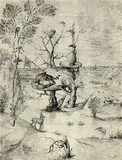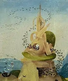 In the high distance of the background, above the hybrid stone formations, four groups of people and creatures are seen in flight. On the immediate left a human male rides on a chthonic solar eagle-lion. The human carries a triple-branched tree of life on which perches a bird; according to Fraenger "a symbolic bird of death". Fraenger believes the man is intended to represent a genius, "he is the symbol of the extinction of the duality of the sexes, which are resolved in the ether into their original state of unity".[40] To their right a knight with a dolphin tail sails on a winged fish. The knight's tail curls back to touch the back of his head, which references the common symbol of eternity: the snake biting its own tail. On the immediate right of the panel, a winged youth soars upwards carrying a fish in his hands and a falcon on his back.[40] According to Belting, in these passages Bosch's "imagination triumphs ... the ambivalence of [his] visual syntax exceeds even the enigma of content, opening up that new dimension of freedom by which painting becomes art."[15] Fraenger titled his chapter on the high background "The Ascent to Heaven", and wrote that the airborne figures were likely intended as a link between "what is above" and "what is below", just as the left and right hand panels represent "what was" and "what will be".[41]