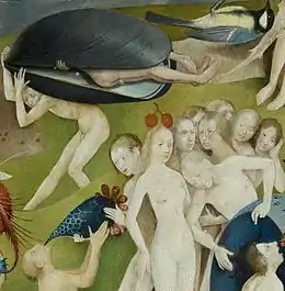 The impression of a life lived without consequence, or what art historian Hans Belting describes as "unspoilt and pre-moral existence", is underscored by the absence of children and old people.[38] According to the second and third chapters of Genesis, Adam and Eve's children were born after they were expelled from Eden. This has led some commentators, in particular Belting, to theorise that the panel represents the world if the two had not been driven out "among the thorns and thistles of the world". In Fraenger's view, the scene illustrates "a utopia, a garden of divine delight before the Fall, or—since Bosch could not deny the existence of the dogma of original sin—a millennial condition that would arise if, after expiation of Original Sin, humanity were permitted to return to Paradise and to a state of tranquil harmony embracing all Creation."[39]