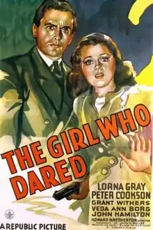 The Girl Who Dared is a 1944 American mystery film directed by Howard Bretherton and written by John K. Butler. The film stars Lorna Gray, Peter Cookson, Grant Withers, Veda Ann Borg, John Hamilton and Willie Best. The film was released on August 5, 1944, by Republic Pictures.[1][2][3]