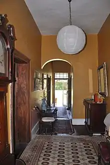 The original farmhouse has a verandah which originally surrounded the house entirely and is believed to be one of earliest examples of a wrap-around verandah built in Australia.[11] The verandah has been enclosed on two northern corners to form rooms that now connect the farmhouse to the cottage and the kitchen-garage wing. An "outdoor" room has also been added c.1980 near the southwest corner of the farmhouse. The verandah has a separated roof with a lower pitch than the main roof, a solution favoured aesthectially from the mid-1830s.[12] The walls of the farmhouse are rendered brickwork. A partition wall within the kitchen wing is constructed of pise. The original windows on the farmhouse are timber-framed, double-hung with six lights per pane, fine glazing bars and mostly original glass. The original entrance (facing south towards the river) has a formal symmetrical facade with a central door and half round fan-light with 8 panels. The original shingles for the roof, manufactured locally, are believed to be still in place beneath the corrugated iron roof. The most intact part of the original farmhouse is its hallway.[1]