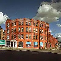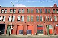 The former warehouse occupied by the club was at 11–13, Whitworth Street West on the south side of the Rochdale Canal: the frontage was curved and built of red Accrington brick. Before it was turned into a club, The Haçienda was a yacht builder's shop and warehouse.