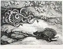 The hedgehog and the snake, alternatively titled The snakes and the porcupine, was a fable originated by Laurentius Abstemius in 1490. From the following century it was accepted as one of Aesop's Fables in several European collections.