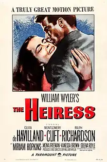 The Heiress is a 1949 American film produced and directed by William Wyler and starring Olivia de Havilland as Catherine Sloper, Montgomery Clift as Morris Townsend, and Ralph Richardson as Dr. Sloper. Written by Ruth and Augustus Goetz, adapted from their 1947 play The Heiress. The play was suggested by the 1880 novel Washington Square by Henry James. The film is about a young naive woman [de Havilland] who falls in love with a handsome young man, [Clift] despite the objections of her emotionally abusive father who suspects the man of being a fortune hunter.[2][3]