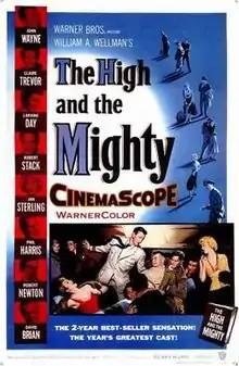 The High and the Mighty is a 1954 American disaster film directed by William A. Wellman and written by Ernest K. Gann who also wrote the 1953 novel on which his screenplay was based.[3] Filmed in WarnerColor and CinemaScope, the film's cast was headlined by John Wayne, who was also the project's co-producer. Composer Dimitri Tiomkin won an Oscar for his original score while his title song for the film also was nominated for an Oscar (although the title song did not actually appear in release prints nor in the recent restoration of the film). The film received mostly positive reviews and grossed $8.5 million in its theatrical release.[2][4] The supporting cast includes Claire Trevor, Laraine Day, Robert Stack, Jan Sterling, Phil Harris, and Robert Newton.