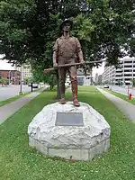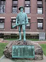 The original statue was unveiled at the University of Minnesota on Memorial Day, 1906.[4] The statue stands in front of the armory at 15 Church Street. Also known as the Student Soldier Memorial, it is a monument to the 218 University of Minnesota students who served in the Spanish–American War.[5] The statue is 9 feet (2.7 m) tall and stands on a 6-foot (1.8 m) granite base, depicting a soldier clad in a period uniform with a campaign hat and a Krag-Jørgensen rifle. Today this statue, now missing the muzzle of the rifle,[6] is popularly known as Iron Mike.[5]
