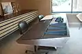 The elevated house with its lean modernist lines and industrial materials, is open plan with the spaces signified by furniture arrangement. It is spare, spacious and functional, yet comfortable. The concrete interior staircase is lit by a sunken uplight. Décor includes signature wall papers, innovations such as mechanised blinds over the floor to ceiling windows, convertible work desks, multipurpose cabinets (some with interior lighting), concealed storage and bedroom ensuites. There were originally five bedrooms, later four, and the colour scheme is neutral ranging from cream or white, shades of brown to chocolate and black with some sky blue accessories. In contrast, there is one lavish bespoke glass chandelier on the landing. The Homewood served as Gwynne's living portfolio to clients and students, exhibiting his designs from architecture to furniture, finishes and fittings, as well as attention to detail and complete design control.