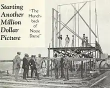Universal Weekly, the house publication of Universal, formally announced the production of The Hunchback of Notre Dame in August 1922.[10] The next issue stated that the Universal Scenario Department was working on the continuity and that preliminary plans for the sets were being drafted.[11] In September 1922, Universal Weekly announced Lon Chaney's intention for it to have him act in his final "cripple role", following the successes of both The Miracle Man and The Penalty.[12] Chaney's ownership of the film rights allowed him contractual latitude for far more artistic approval and control of this production than he had had in previous ones; for this, he would thus serve as an uncredited, de facto producer; Thalberg was undoubtedly complicit in such an arrangement, with it serving to prevent Carl Laemmle from cutting costs on the "artistic" production.[8]