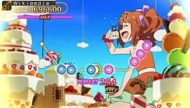 The original PlayStation Portable (PSP) versions of the Shiny Festa games sold 119,132 units in their first week of sales, and together ranked as the best-selling video game in Japan that week.[24] The PSP versions received a combined review score of 32 out of 40 from the Japanese video game magazine Famitsu.[25] At the third Newtype Anime Awards in 2013, Shiny Festa's anime sequences received first place in the Game Animation category.[26] Critics commonly agree that Shiny Festa, while it appeals to the franchise's existing fans, is accessible and welcoming to new fans whose first exposure to the franchise is its anime adaptation.[27][28][29] Japanator's Jeff Chuang wrote that the game is "twice the fun" to fans of the franchise's songs, while Elliot Gay, writing for the same website, argued that the games' inclusion of anime material pointed to the game's development as "fanservice for fans".[27] Reviewers also agreed that despite its simple gameplay, Shiny Festa still provides substantial challenge. Famitsu's reviewers wrote that while the game has a simpler control scheme compared to other rhythm games, it becomes difficult when played on the Master difficulty.[25] Gay and Chuang both agreed that the simple gameplay becomes appropriately difficult with the higher difficulties,[27] while ASCII Media Works' Lipton Kumada noted that the game becomes harder as variations such as simultaneous and long icons are added.[30]