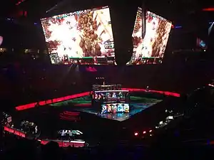 The crowdfunded prize pool of US$20,770,460 surpassed the previous International's total of $18.4 million, overtaking it as the largest esports tournament prize pool in history until being surpassed by the following year's International.[4][17][18][19] The venue where the event took place, the KeyArena in Seattle, was sold out, with millions of additional spectators watching the event via livestreaming platforms worldwide.[20] The tournament's opening ceremony featured Valve president Gabe Newell, who called the event a "high point of the year" for everybody at the company, as well as violinist Lindsey Stirling, who performed some of the game's soundtrack on stage.[21] The tournament was considered to be one of the best in esports history, with multiple upsets and underdog teams performing well throughout.[22][23] Production values of the tournament itself were also praised, with Valve, the game's developer and event organizer, implementing technologies such as augmented reality (AR) into the live broadcast, which showed the game's playable characters on screen as if they there in person.[20]