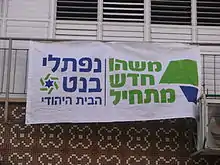 The Jewish Home (Hebrew: הַבַּיִת הַיְהוּדִי, HaBayit HaYehudi) is an Orthodox Jewish and religious Zionist political party in Israel.[4] It was originally formed by a merger of the National Religious Party, Moledet, and Tkuma in November 2008. However, Moledet broke away from the party after its top representative was placed only 17th on the new party's list for the 2009 Knesset elections, and instead ran on a joint list with Hatikva.[5] Tkuma later also left to join the National Union.
