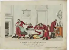 The etymology of the Club’s name remains unclear. There are three theories as to its origin: 1. It is a corruption or anglicisation of the Scots name of the town of ‘Kennoway’/‘Kennoton’, a town in Fife less than two miles from Castle Balgonie; 2. It is a corruption or anglicisation of the old Scots term ‘keest-an-ton’ meaning ‘a vigorous shout or hunting cry’; and 3. There is some suggestion in the Club’s own history that ‘Kensington’ may have been the name of a mutually funded race horse owned by the club at some point in it’s early history.The evidence for the continued activities of the club are unsurprisingly scanty in the historical record. A print collection of 1814, by an anonymous Frenchman, contains a plate which is generally supposed to show the Kensington Club at dinner, entitled “L’Après Dinée des Écossais - Scenes á St Andrewes”. The engraving depicts seven men in matching maroon tailcoats in the later throws of a drunken dinner party (maroon and green being the club colours).