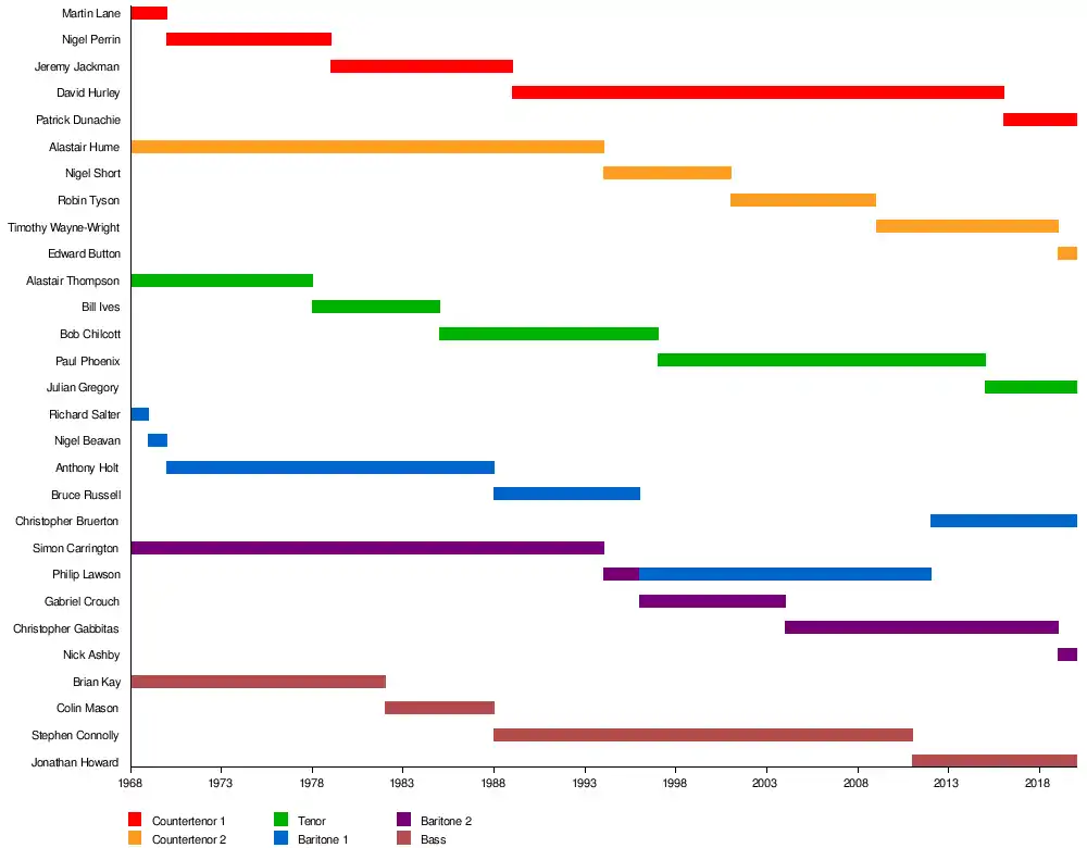 Former members of the King's Singers also include Jeremy Jackman, Bob Chilcott,[1] Nigel Short, Bill Ives, Bruce Russell, Colin Mason, Gabriel Crouch, Stephen Connolly, Robin Tyson, Philip Lawson, Paul Phoenix, David Hurley, Christopher Gabbitas and Timothy Wayne-Wright. There have been 26 members of the King's Singers since the original stable group was established in late 1969, for whom the average length of tenure is around 12 years.