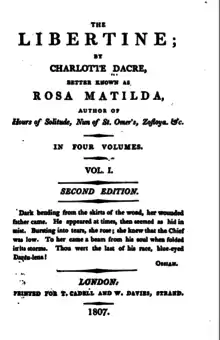 The Libertine is an 1807 English novel by Charlotte Dacre, written under the pseudonym Rosa Matilda. This was her third novel, published in four parts and collected into a single volume. It follows similar themes to Zofloya around the impact of female desire and libertinism. The Libertine was highly criticized after its publication due to the excess of language, improbable plot and supposedly immoral message. The Libertine follows the journey of Gabrielle after her seduction by a libertine, and the repercussions of his infidelity and their marriage-less relationship.