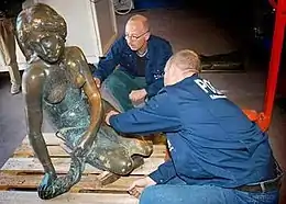 On January 6, 1998, the statue was decapitated again;[9][10] the culprits were never found, but the head was returned anonymously to a nearby television station, and reattached on February 4. On the night of September 10, 2003, the statue was knocked off its base with explosives and later found in the harbour's waters. Holes had been blasted in the mermaid's wrist and knee.[11]