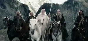 Aragorn, Legolas, and Gimli pursue a band of Uruk-hai to save their companions Merry and Pippin, entering the kingdom of Rohan. The Uruk-hai are ambushed by a group of Rohirrim, allowing the Hobbits to escape into Fangorn Forest. Meeting Aragorn's group, the Rohirrim's leader Éomer explains that he and his men have been exiled by Rohan's king, Théoden, who is under the control of Saruman and his servant Gríma Wormtongue. Éomer believes Merry and Pippin were killed during the raid but leaves the group two horses. Searching for the Hobbits in Fangorn, Aragorn's group encounters Gandalf, who reveals that after his fight against the Balrog he was resurrected as Gandalf the White to help save Middle-earth.