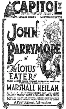 The Lotus Eater is a 1921 American silent romantic drama film produced and directed by Marshall Neilan and released through Associated First National. The Lotus Eater starred John Barrymore with Colleen Moore as the female lead. The Lotus Eater is now considered lost.[1][2][3]