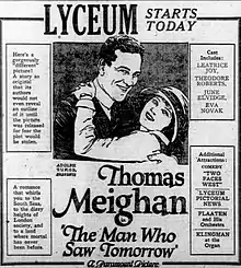 The Man Who Saw Tomorrow is a lost[1] 1922 American silent drama film directed by Alfred E. Green and written by Frank Condon, Will M. Ritchey, and Perley Poore Sheehan. The film stars Thomas Meighan, Theodore Roberts, Leatrice Joy, Alan Roscoe, Alec B. Francis, June Elvidge, and Eva Novak. The film was released on October 29, 1922, by Paramount Pictures.[2][3]