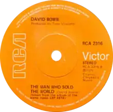 "The Man Who Sold the World" was released as the eighth and penultimate track on Bowie's third studio album of the same name in November 1970 in the US and in April 1971 in the UK by Mercury Records.[21][22] Although no singles were issued from the album,[23] the song appeared as the B-side on the 1973 reissue US single release of "Space Oddity" and UK single release of "Life on Mars?", both by RCA Records.[24][25]